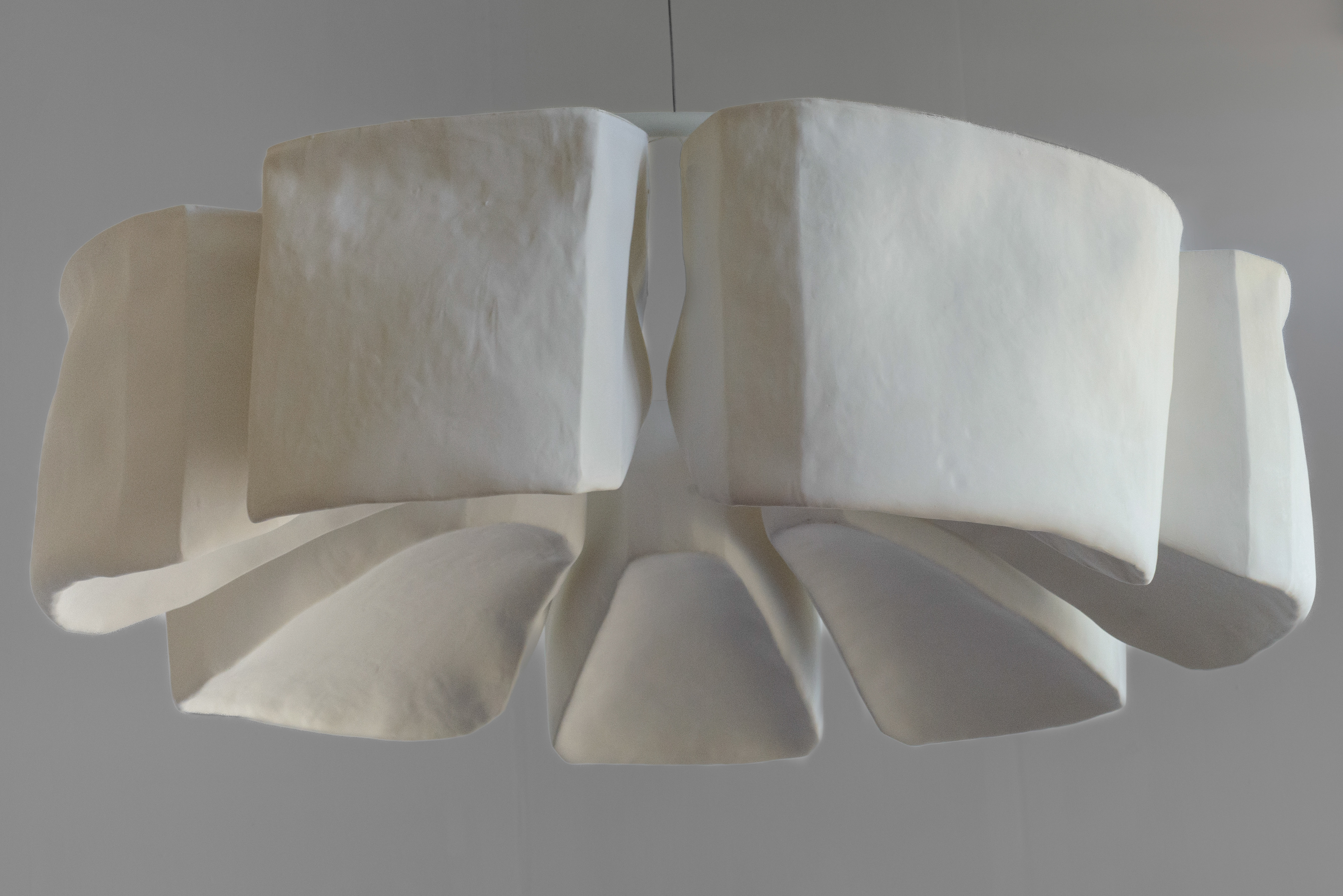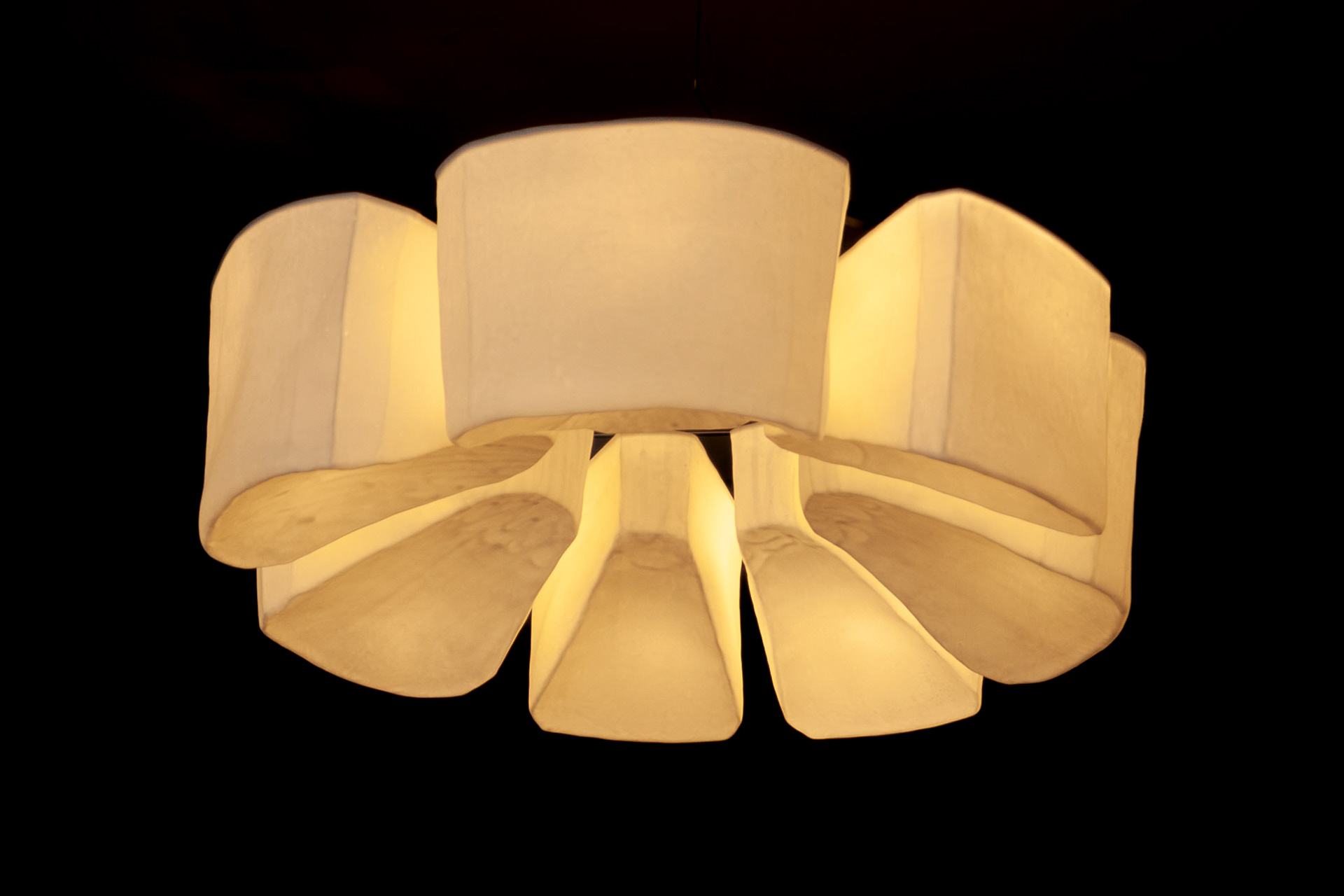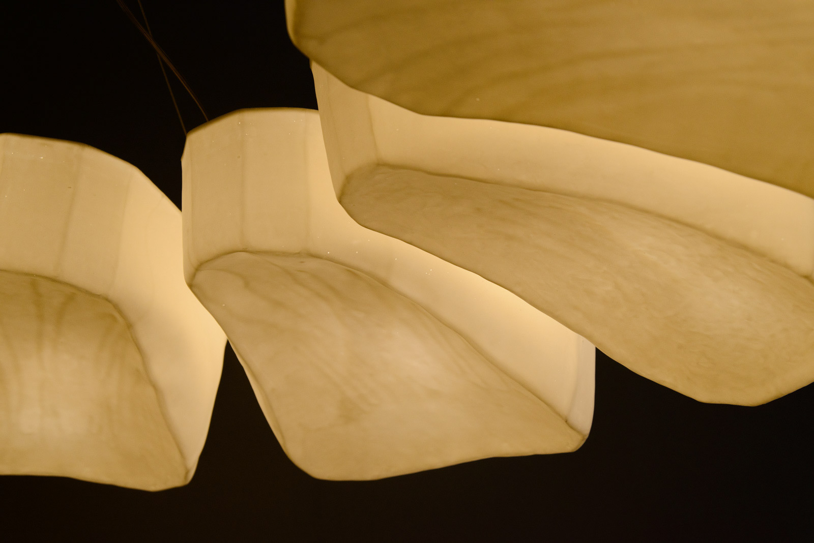 The Dome China is a dome-shaped suspended lamp, made by hand from translucent bone china. It has monumental dimensions and appearance and is made up of seven parts that differ in light color and intensity by variables such as wall thickness and size.