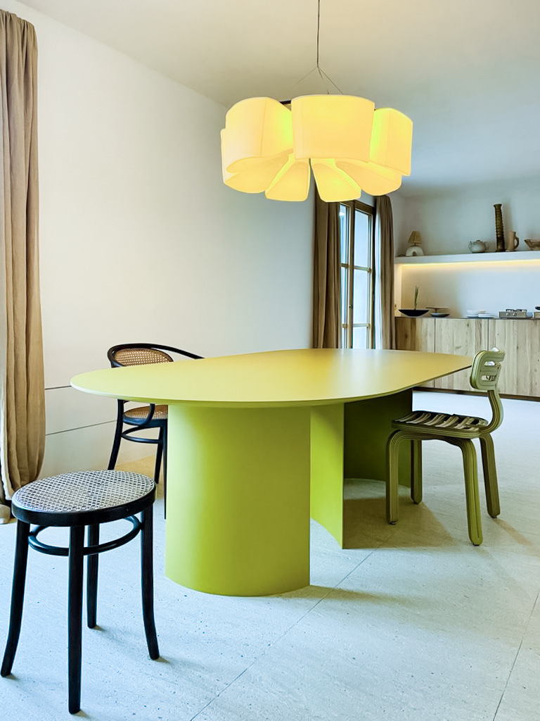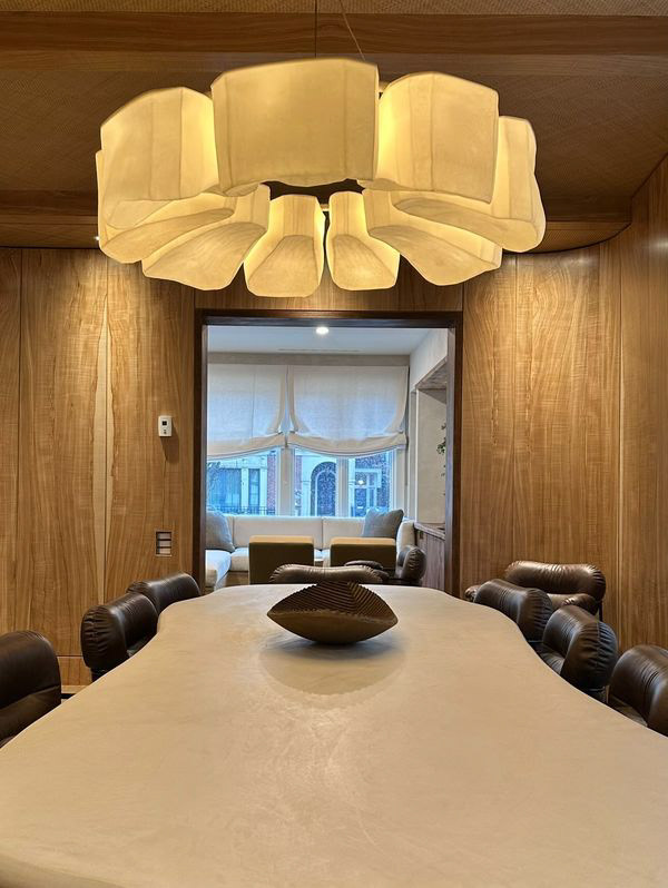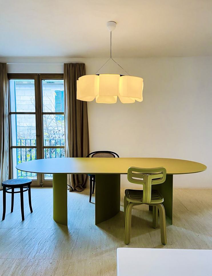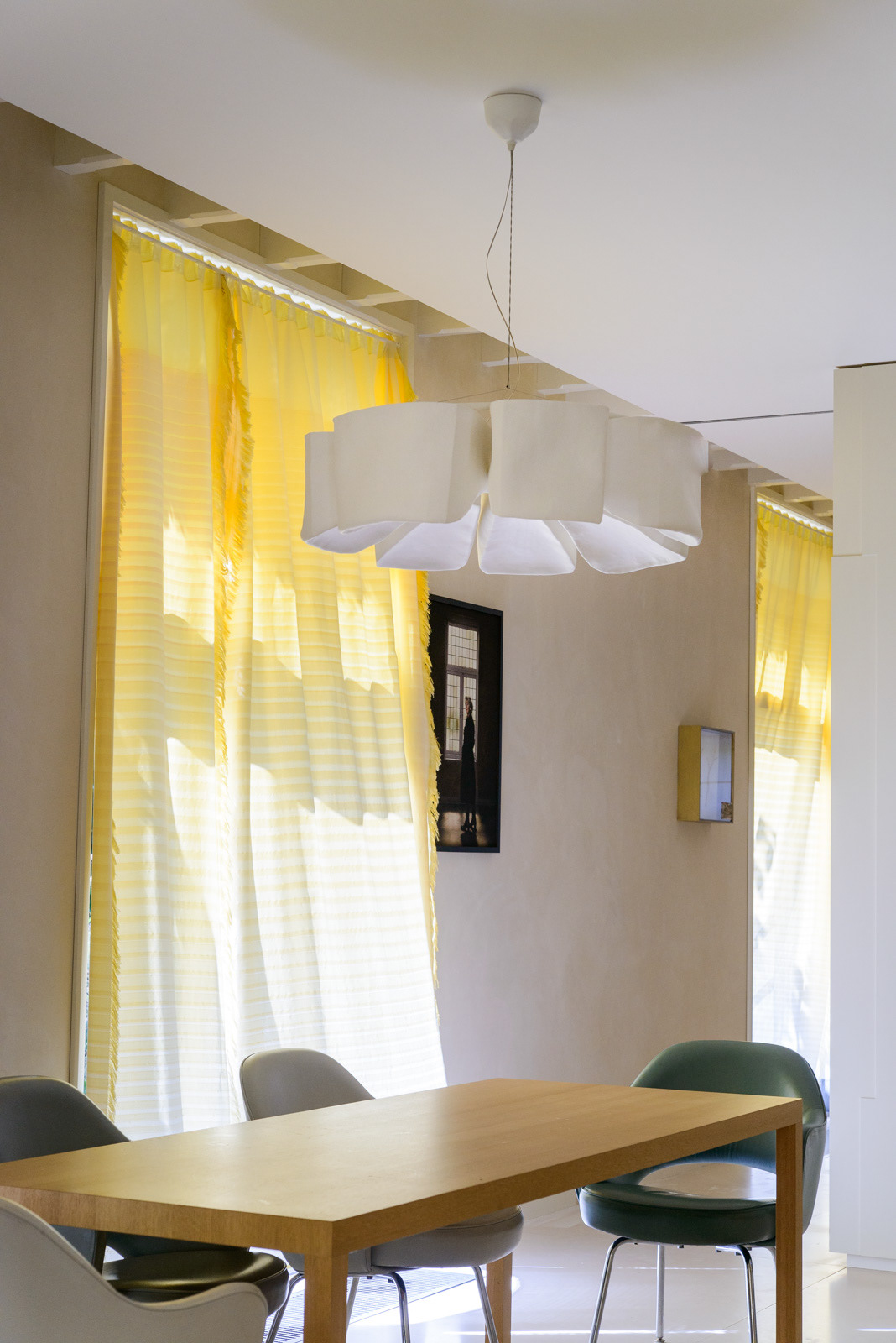 The Dome China is a dome-shaped suspended lamp, made by hand from translucent bone china. It has monumental dimensions and appearance and is made up of seven parts that differ in light color and intensity by variables such as wall thickness and size.