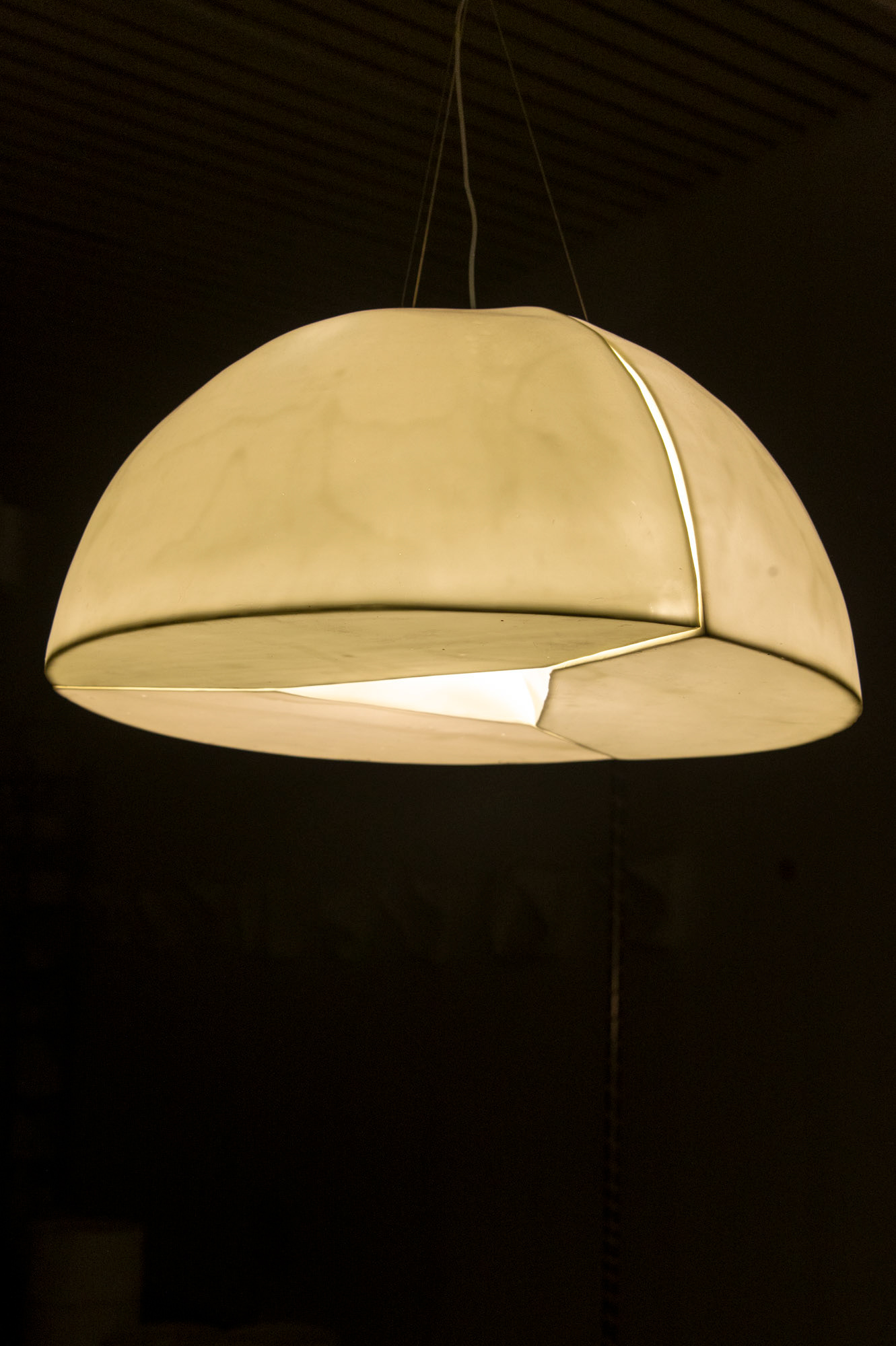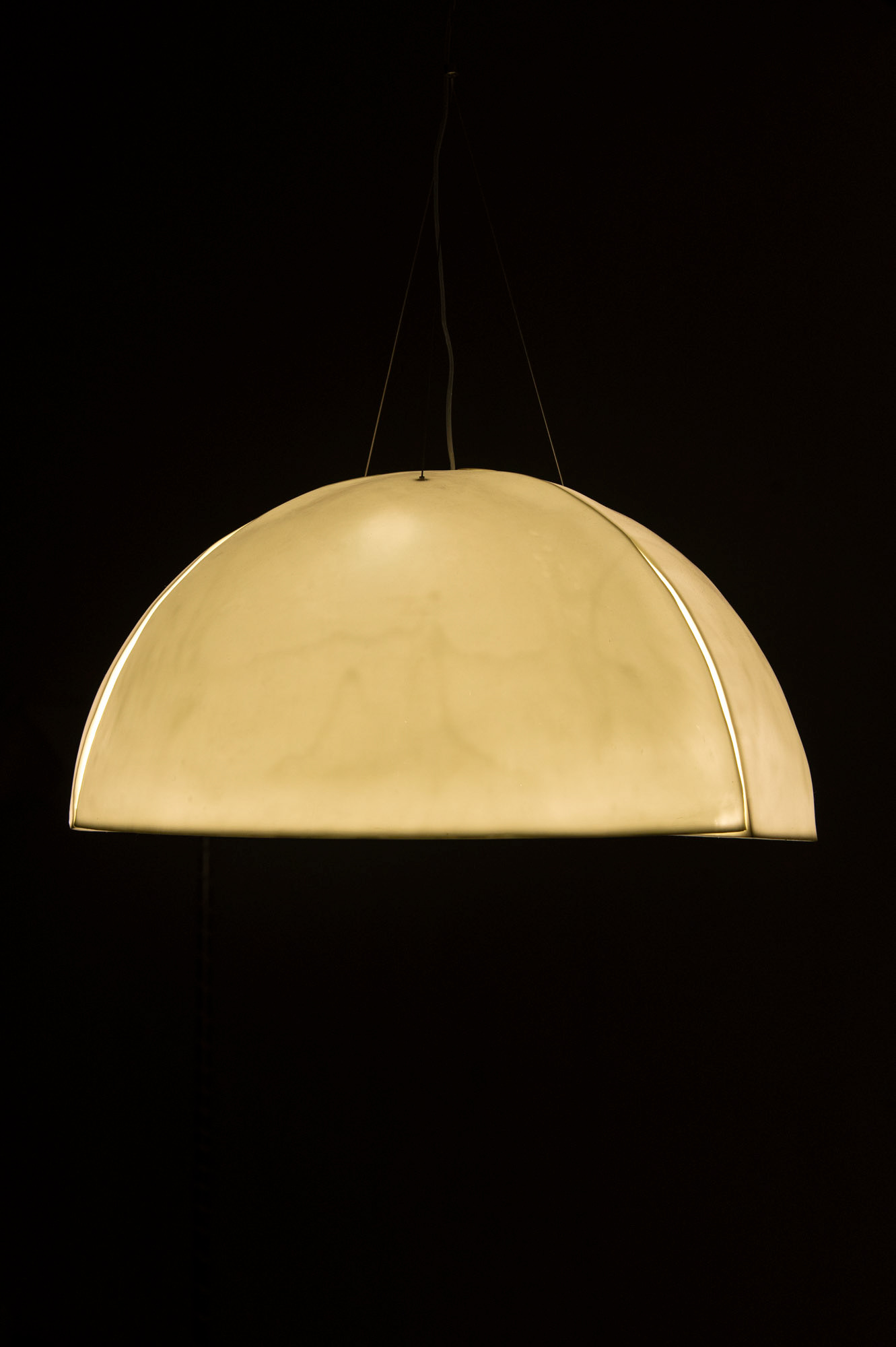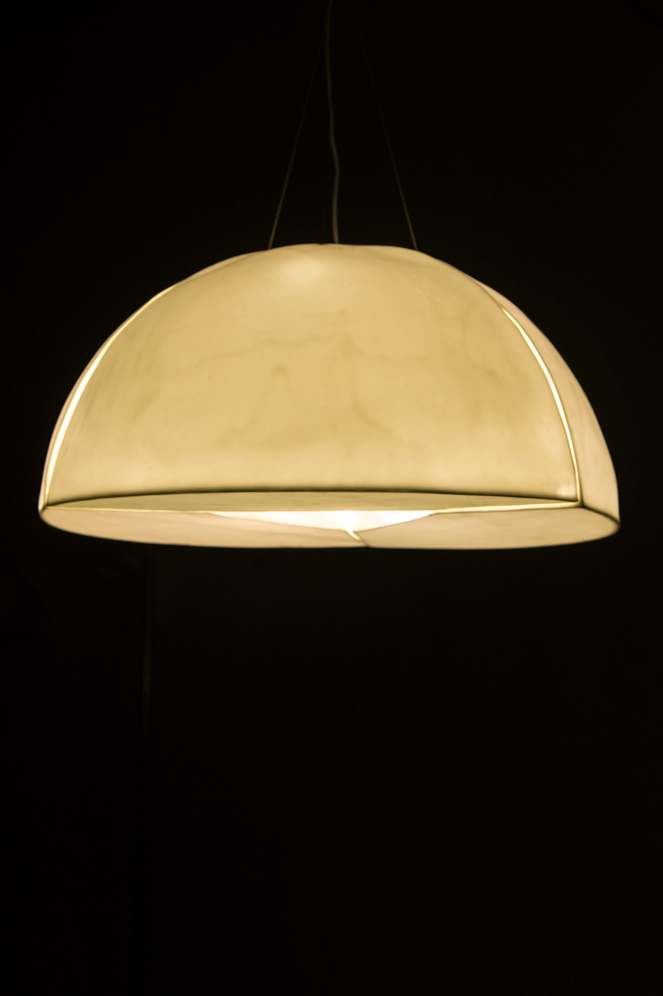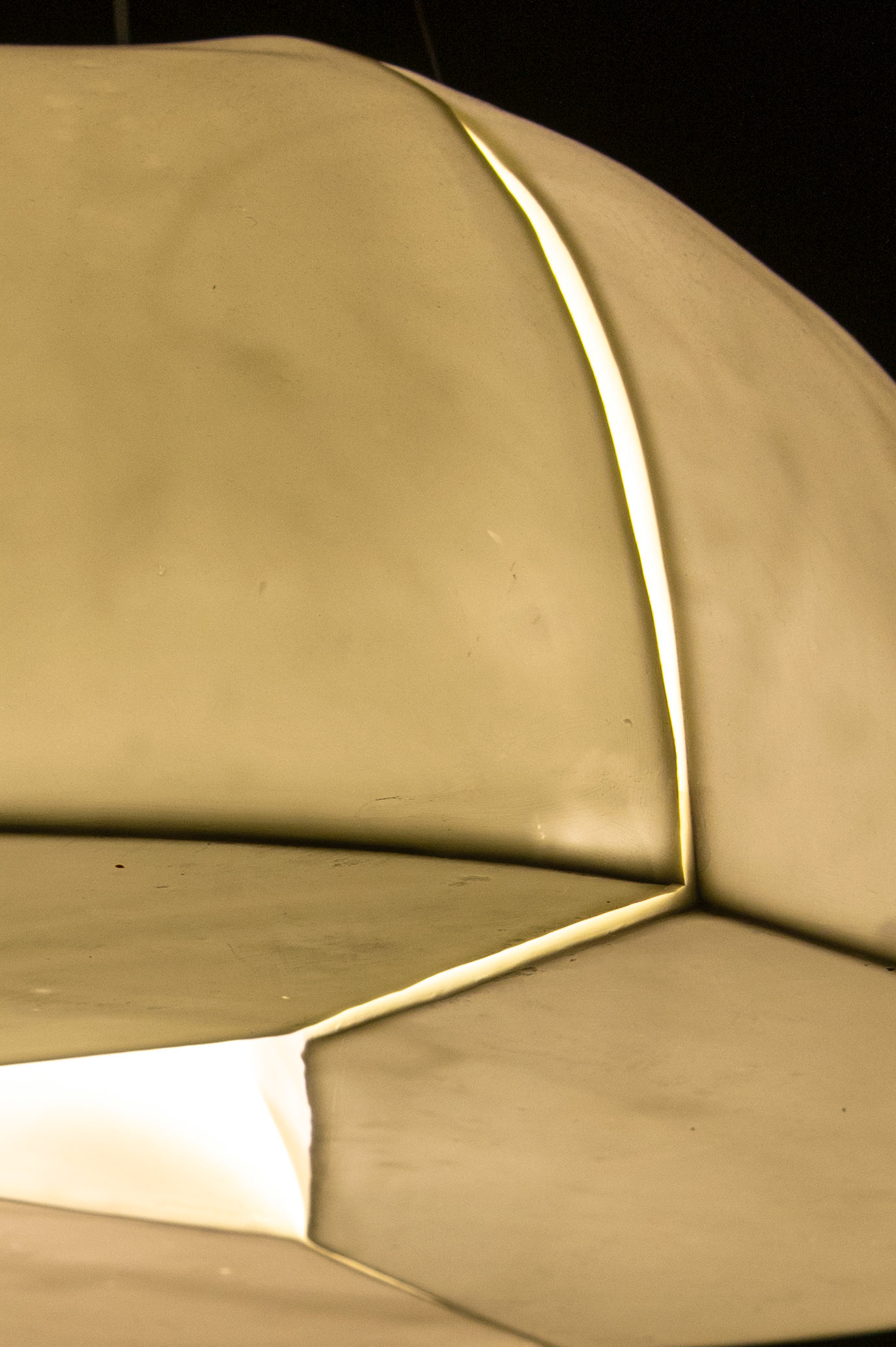 Three equal parts that hang against each other and together form a hemisphere. The shapes are partially 'cut off', creating a triangular space at the bottom.